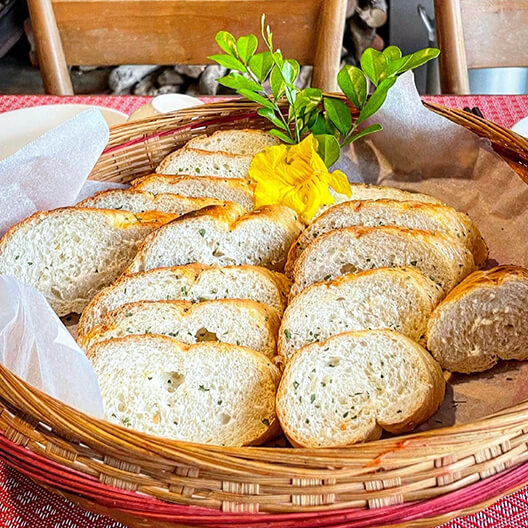 帶有嚼勁的法棍,經過烤廂稍微碳烤外皮而變得更加脆口;塗上奶油,又香又脆讓人不禁一片接著一片。