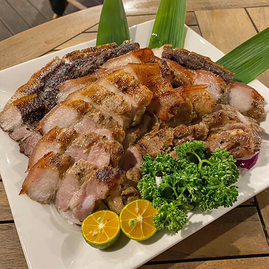 烤廂主廚採用當天現宰溫體豬,並且到當地市場找契作的小農採買曬乾的馬告;馬告的味道與檸檬香茅相似,可以將豬肉的油膩感消除,讓這道碳烤料理帶有清爽的感覺。