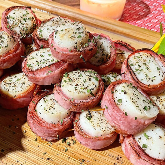 烤廂採用新鮮急凍技術的干貝用培根包裏著,再以玫瑰鹽以及黑胡椒粒提味,用山珍海味來形容這道料理一點也不為過。